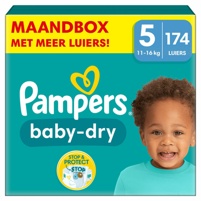 Luiers Maat 5 (11-16kg)Je baby beweegt ’s nachts voortdurend tijdens het slapen. Daarom hebben Pampers Baby-Dry nu een Stop & Protect pocket aan de achterkant die tot 100% bescherming biedt tegen lekken ’s nachts. Net zoals bij jou, komt jouw baby’s veiligheid bij Pampers op de eerste plaats: Pampers Baby-Dry luiers zijn dermatologisch getest en bevatten 0% EU-parfumallergenen (zoals gereglementeerd in de regelgeving voor