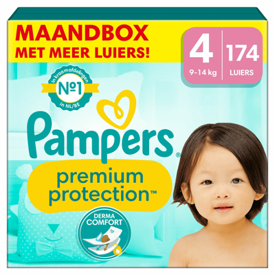 Luiers Maat 4 (9-14 kg)Pampers N°1 luiers voor comfort en bescherming van de gevoelige huid. Langdurig contact met urine en ontlasting kan de gevoelige huid van je baby irriteren, wat ongemakkelijk en pijnlijk kan zijn voor je baby. Pampers Premium Protection luiers zijn speciaal ontworpen zodat ze heel zacht aanvoelen en tegelijk de huid beschermen dankzij 1) een unieke DermaComfort toplaag met absorberende poriën die urine en ontlasting onmiddellijk weghoudt van de huid en vasthoudt in de kern van de luier. Zo blijft de gevoelige huid van je baby droog en beschermd. 2) Daarnaast laten miljoenen microporiën lucht vrij in de luier circuleren om de huid droog te houden; en 3) Tot 100% bescherming tegen lekken dankzij een uniek 3-voudig beschermingssysteem dat urine snel absorbeert en lekken ter hoogte van de taille en rond de beentjes helpt voorkomen; 4) Ultrazachte materialen die je baby in een wolk van comfort en bescherming hullen. Pampers Premium Protection, de N°1 keuze van de kraamafdelingen in Nederland*, zijn 100% veilig voor de huid van je baby. Ze zijn dermatologisch getest en bevatten geen van de EU-parfumallergenen.* Miljoenen microporiën laten lucht vrij in de luier circuleren om de huid droog te houden* Tot 100% bescherming tegen lekken dankzij een uniek 3-voudig beschermingssysteem dat urine snel absorbeert en lekken ter hoogte van de taille en rond de beentjes helpt voorkomen* Ultrazachte materialen hullen je baby in een wolk van comfort en bescherming* Ultrazachte flexibele zijkanten die zich soepel aanpassen aan het buikje van je baby om te helpen huidirritatie te voorkomen* De urine-indicator wordt blauw zodat je weet wanneer je de luier kan verschonen* Dermatologisch getest en 0% EU parfumallergenen* Een selectie aan schattige tekeningen die verschilt per verpakking*Op basis van de verdeling van Pampers Premium Protection luiers maat 0-2 in Nederlandse kraamafdelingen, jan-dec 2021